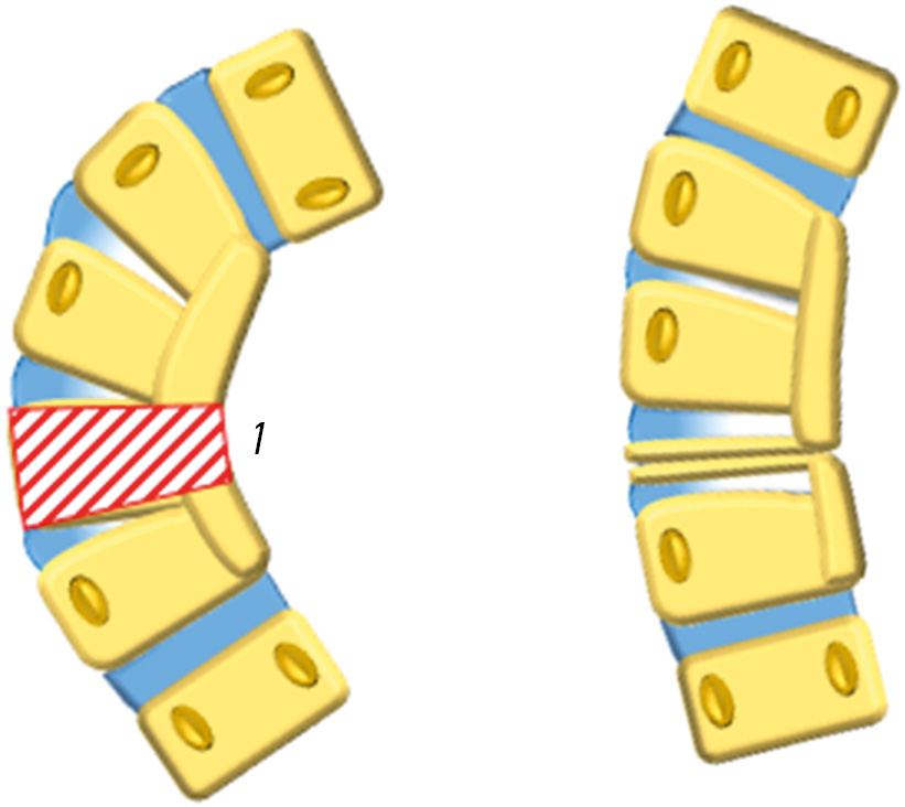 Unilateral blockage of the lateral surfaces of the vertebral bodies is a congenital abnormality of spinal development, which is distinguished by rapid deformity progression [1, 2]. Partial blockage of the anterior surfaces of the vertebral bodies resulted in pathological kyphosis, and impaired segmentation of the posterior and lateral parts of the vertebrae leads to pathological lordoscoliosis [3, 4]. An unsegmented bar is considered in case of impairment of the segmentation of the lateral surfaces of the vertebral bodies, which represents the undifferentiated lateral surfaces of two or more vertebral bodies (Fig. 1).