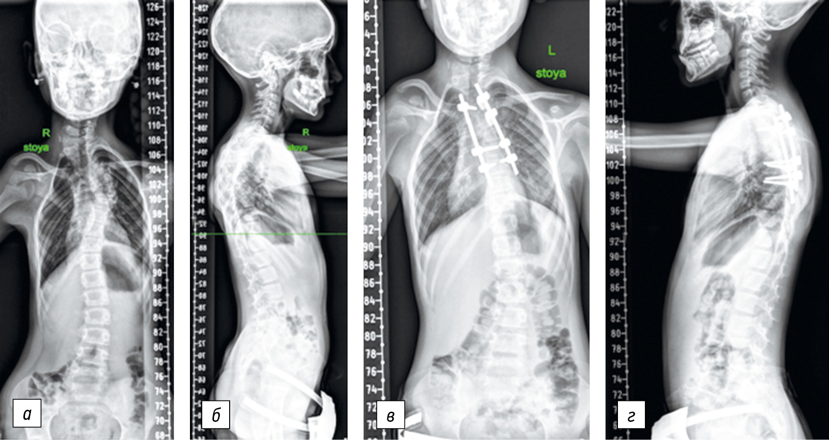 Fig. 5. Panoramic X-ray of the spine in frontal and lateral projections before (a, b) and after (c, d) surgery. A 9-year-old patient; after corrective wedge osteotomy with correction and stabilization of spinal deformity using a multi-support corrective system