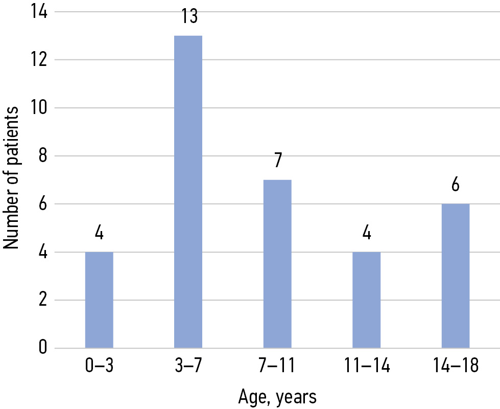 The following data were collected: case histories, radiological examination (X-ray images, multispiral computed tomography data), and magnetic resonance imaging of 33 patients with congenital deformity of the spine associated with segmentation disorders of the lateral surfaces of the vertebrae. Regarding gender, there were 17 girls and 16 boys. The average age at the time of surgical treatment was 107.5 (minimum, 36; maximum, 211 months; M=101) months. The patients were distributed by age based on the classification proposed by Gundobin (Fig. 3).