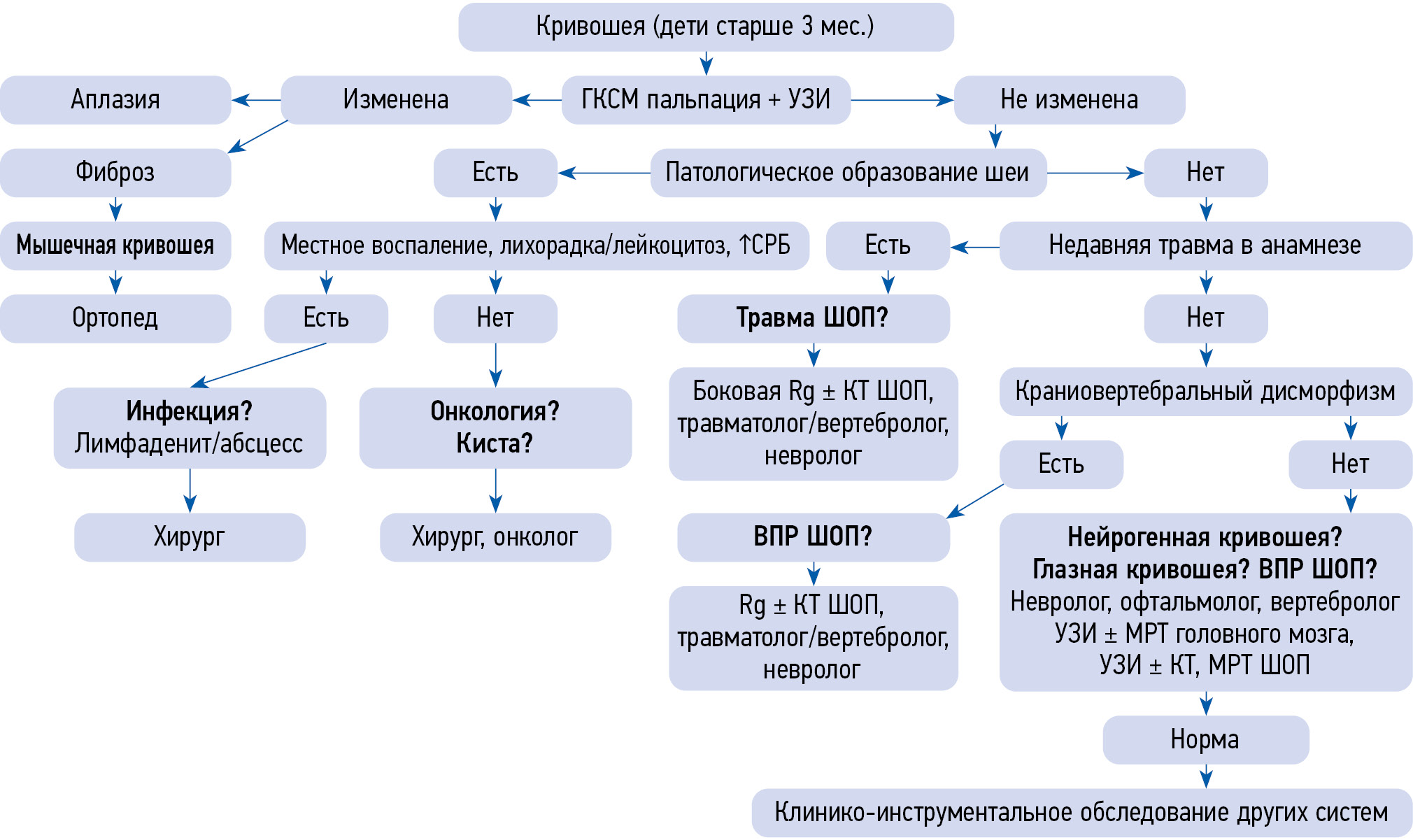 Клиническое обследование | · Положение головы (наклон к плечу, поворот и др.). · Голова и лицо (лицевая асимметрия, плагиоцефалия). · Амплитуда/болезненность активных и пассивных движений в ШОП (при отсутствии факта недавней травмы). · Пальпация шеи (общая, ГКСМ, ШОП) — патологические образования, болезненность, лимфатические узлы. · Краниоцервикальные дисморфии. · Общий педиатрический осмотр. · Инфекционные симптомы — лихорадка, боль в горле и др. · Неврологические симптомы — косоглазие, атаксия и др. · Консультация узких специалистов (по показаниям): ортопед, травматолог, хирург, вертебролог, невролог, офтальмолог (с оценкой полей зрения), отоларинголог, инфекционист, гастроэнтеролог, нейрохирург, ревматолог, генетик и др. |
