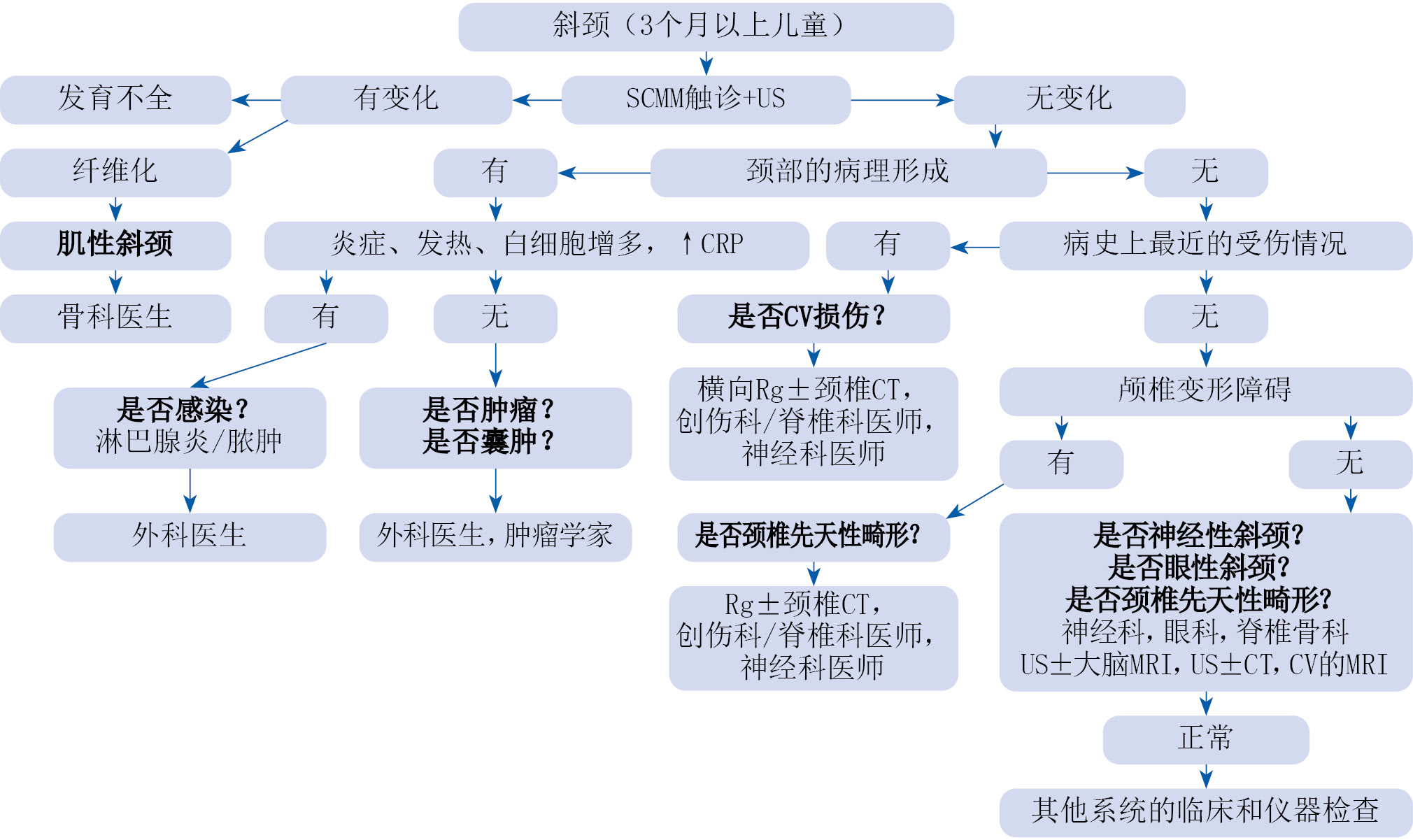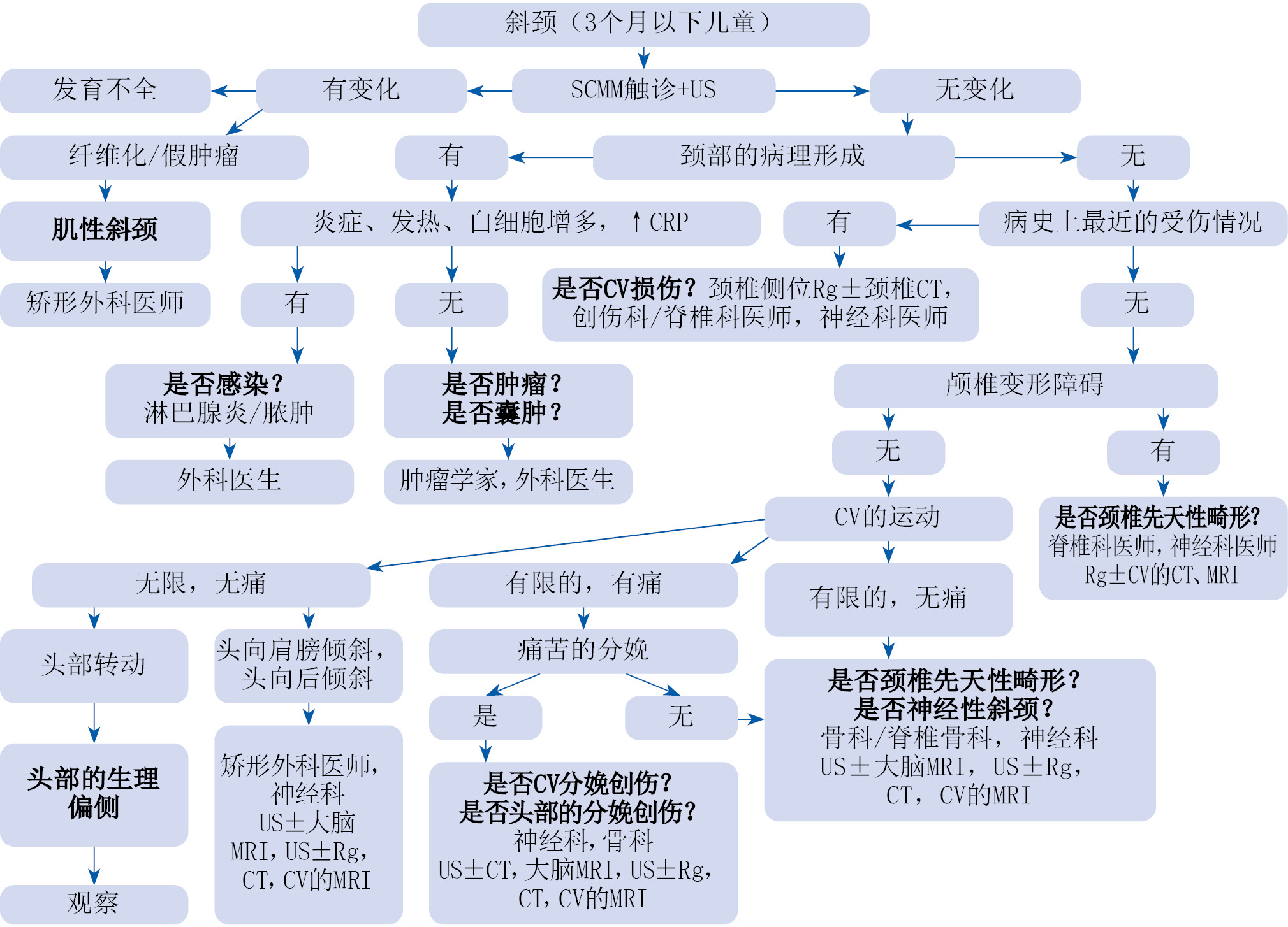 图 2 低龄儿童斜颈的鉴别诊断算法。SCMM—胸锁乳突肌;CM—先天畸形;CRP—C-反应蛋白;CV—颈椎;Rg—放射线照相术