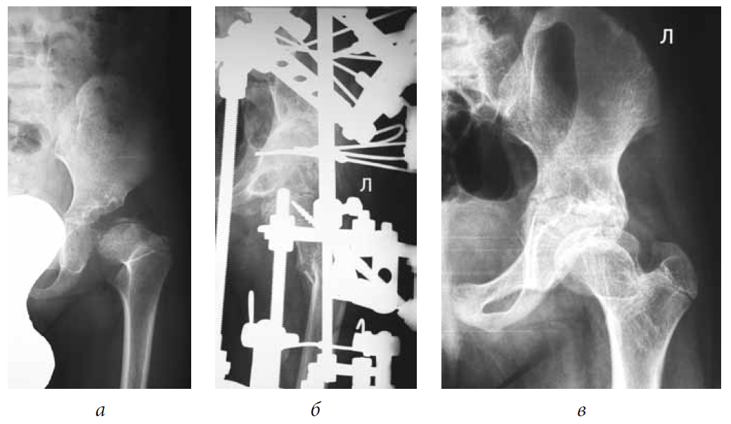 Рис. 2. Пациентка Д., 4 года, с диагнозом: «Подвывих левого бедра II степени дислокации, асептический некроз головки бедра II степени» и ее рентгенограммы: а — рентгенограмма тазобедренного сустава в прямой проекции до лечения; б — рентгенограмма тазобедренного сустава в прямой проекции в процессе лечения (после выполнения туннелизации шейки и головки бедра, внесуставной реконструкции тазового и бедренного компонентов сустава, аппаратной декомпрессии сочленения); в — рентгенограмма тазобедренного сустава в прямой проекции на контрольном осмотре через 3 года после лечения
