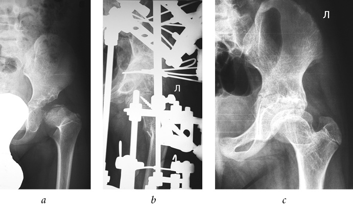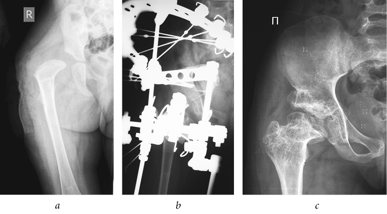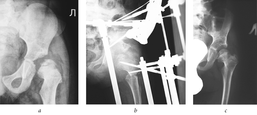 Fig. 3. Patient F., 4 years old, with a diagnosis of congenital dislocation of the right hip, degree III of dislocation, and degree IV Perthes disease: a — frontal radiograph of the hip joint before treatment; b — frontal radiograph of the hip joint during treatment (after performing an open reduction of the dislocation, shortening correcting osteotomy of the hip, osteotomy of the iliac bone, tunneling of the femoral neck and head, hardware decompression of the articulation); c — frontal radiograph of the hip joint 4 years after treatment