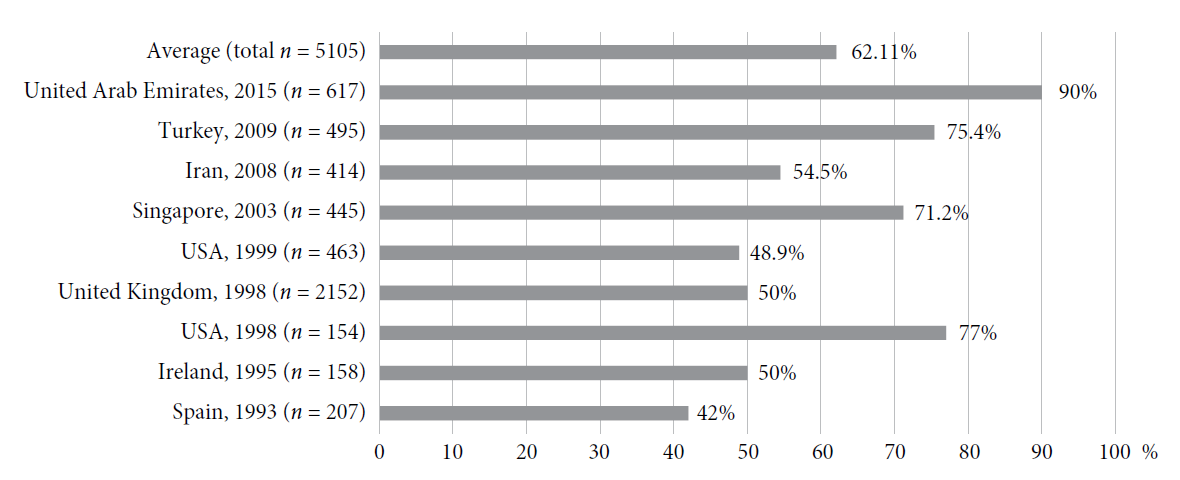 According to various studies, the rate of baby walker use worldwide is quite high, ranging from 42% to 95% (Fig. 1), with an average of 62.11% ± 18.5% (99% CI, 43.61–80.61) [3–11].