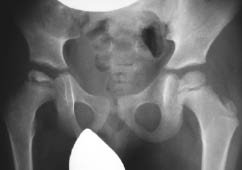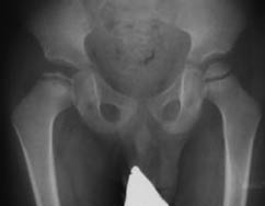 Fig. 1. X-ray of the hip joint in the anteroposterior projection of the patient T., 4 years. Diagnosis: "Perthes disease on the right, stage II", when Catteral II arrives