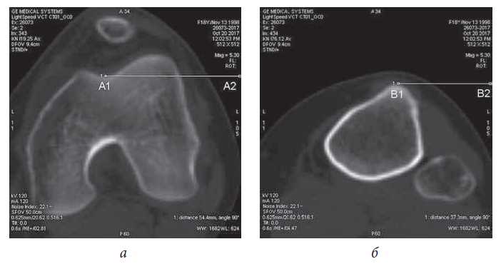 Most parameters for CT of the knee joint are evaluated using axial sections. One of the conditions for performing MSCT is the patient’s ability to fully extend the knee joint. It is only possible to evaluate the majority of parameters, in particular, the slope and/or subluxation of the patella, in this position, as when the knee is bent, the patella is fixed in the notch of the femoral block, and, as a result, these disorders are corrected.
