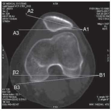 To measure the slope of the patella, a section was used through the femoral block (the same as in the TT–TG measurement) as well as a section through the patella in the projection of the maximum diameter. In some cases, these sections coincided (Fig. 2). Two lines were then drawn: one through the patella in the frontal plane (A1–A2), and another through the posterior margins of the femoral condyles (B1–B3). The angle between the two lines represents the slope angle of the patella. In 90% of patients with patellar instability, this angle is more than 20°. In this group of pediatric patients, arthroscopic stabilization of the patella was performed with a lateral release, and in 10% of patients with a normal slope angle of the patella (less than 20°) the arthroscopic stabilization without a lateral release was conducted. Patients with a large angle of patella slope had a more pronounced pain syndrome at rest and during dislocation. We believe this is due to the fact that a large slope angle of the patella (more than 25°) at the time of dislocation and subluxation is associated with greater damage to the cartilage of the patella and the lateral condyle of the femur.