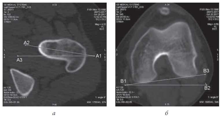 Examination was performed using MSCT in 113 patients with patellar instability who were treated in the Department of Pediatric Trauma and its Consequences of the Priorov National Medical Research Center of Traumatology and Orthopedics from 2012 to 2017. The study was performed using the computer tomograph LightSpeedVcT that was able to obtain 64 slices per revolution of the X-ray tube according to the standard program, with a slice thickness of 0.6 mm. The computer scans for patellar instability examined both lower extremities and provided information on the presence of deformities on the side of the lesion as well as the healthy side. This information enabled preventive maintenance of dislocation and further patellar instability on the contralateral side. Bone deformities were visualized on the side of the lesion to be corrected by surgical treatment. These included excessive patella slope, femoral neck antetorsion (increased external rotation of the femoral condyles), as well as valgus deformity of the knee joint and excessive lateral position of the tibial tuberosity, determined by the TT–TG index. Among these deformities, valgus deformity of the knee joint is of greatest importance in the development of patellar instability, as the tibial tuberosity is located more laterally than normal. Accordingly, this type of deformity of the lower limb most often requires surgical correction.