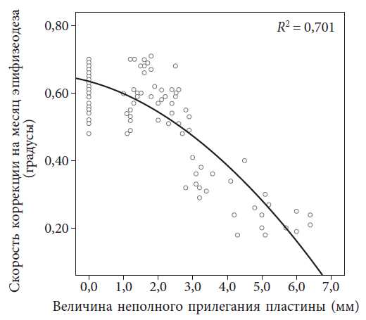 Метод «управляемого роста» существенно изменил подход к коррекции осевых деформаций нижних конечностей у детей, не достигших окончания костного роста [1]. Несмотря на широкое использование указанного метода, техника установки металлоконструкций разработана в основном для пациентов с нормальной формой эпиметафизарного перехода. У детей с системными дисплазиями скелета имеют место анатомические особенности данной области, которые могут вызывать трудности в размещении имплантов. P. Stevens указывает, что в результате неполного прилегания имплантов возникает концентрация напряжения в не погруженной в кость части метафизарного винта, что может приводить к его разрушению [11]. Наше исследование показало, что величина выстояния пластины также влияет на скорость коррекции. Регрессионный анализ продемонстрировал, что при увеличении расстояния неполного прилегания скорость коррекции деформации значительно снижается.