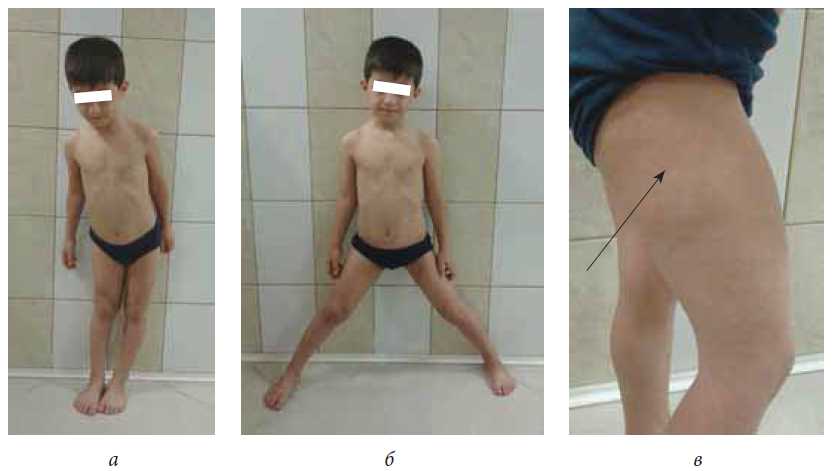 Рис. 1. Фотографии больного Д., 6 лет: a — порочное положение правой нижней конечности и перекос таза в положении стоя; б — положение таза нормализуется при отведении бедер; в — уплотнение мягких тканей по наружной поверхности правого бедра (указано стрелкой)