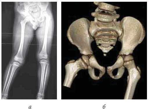Рис. 2. Рентгенограмма нижних конечностей в положении стоя (a) и КТ тазобедренных суставов (б) больного Д., 6 лет, до оперативного лечения