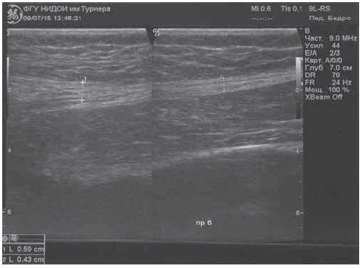 Ультразвуковое исследование (УЗИ) тазобедренных суставов, выполненное на аппарате GE LOGIQ-7, показало, что по латеральной поверхности правого бедра в структуре мышечной ткани лоцируется гиперэхогенный тяж толщиной в верхней трети бедра 5,9 мм, средней — 4,3 мм (рис. 3).