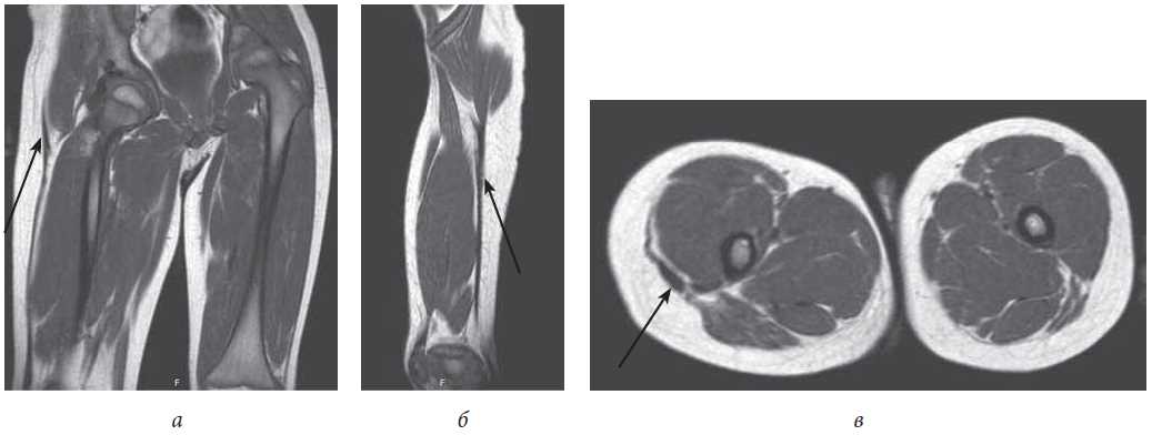 Рис. 4. Компьютерные срезы в коронарной (а), сагиттальной (б) и аксиальной (в) плоскостях, где стрелками указаны утолщенные фиброзные структуры в мягких тканях правого бедра