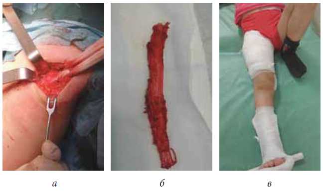 Рис. 5. Фиброзный тяж (взят на марлевую держалку) (а); иссеченный участок фиброзного тяжа (б); послеоперационная фиксация правой нижней конечности (в)