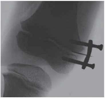 Рис. 6. Рентгенограмма правого коленного сустава на этапе блокирования медиальной порции дистальной зоны роста бедренной кости восьмиобразной пластиной