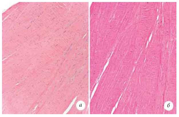 Рис. 7. Продольные срезы одного из участков слабо васкуляризированного фиброзного тяжа: располагающиеся в одном направлении пучки коллагеновых волокон с относительно небольшим количеством несколько неравномерно распределенных фиброцитов (a — окраска гематоксилином и эозином; б — окраска по Ван Гизону; увеличение ×300)