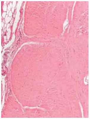 Рис. 8. Тангенциальный срез одного из участков фиброзного тяжа с хорошо различимыми пучками коллагеновых волокон и относительно небольшим количеством фиброцитов. По краю тяжа видна часть тонкой фиброзной «оболочки» с фрагментом ячейки дифференцированной жировой клетчатки (окраска гематоксилином и эозином; увеличение ×300)