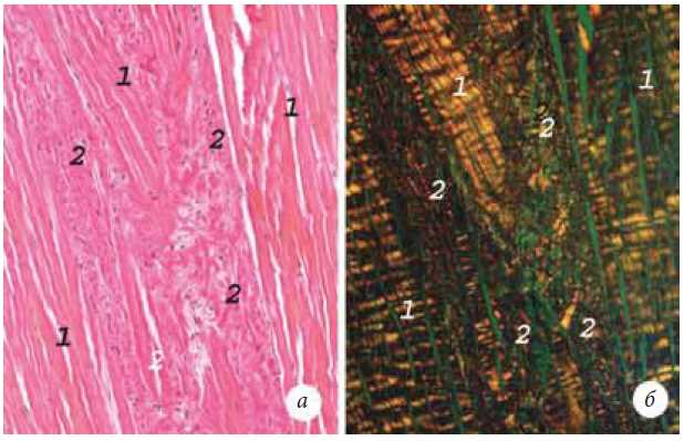 Рис. 9. Продольный срез одного из участков фиброзного тяжа: а — между располагающимися в одном направлении пучками относительно толстых коллагеновых волокон (1) «вклинивается» пласт соединительной ткани, представленный более тонкими хаотично ориентированными коллагеновыми волокнами (2) (окраска по Ван Гизону; увеличение ×600); б — исследование в поляризованном свете того же участка (окраска по Ван Гизону + поляризованный свет; увеличение ×600)
