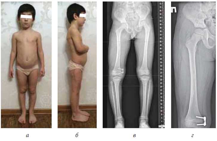 Рис. 10. Фотографии больного Д. через 1 год после оперативного лечения (а, б) и рентгенограммы нижних конечностей и правого бедра перед удалением металлоконструкций (в, г)
