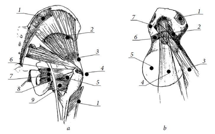 Fig. 2. Anatomy of the proximal femur: a — posterior view of the right hip joint: 1 — the dorsal gluteal muscle (trimmed); 2 — the ventral gluteal muscle (trimmed); 3 — the gluteus minimus muscle; 4 — ventral gluteal muscle (place of attachment); 5 — external obturator muscle; 6 — superior gemellus muscle; 7 — internal obturator muscle; 8 — inferior gemellus muscle; 9 — sciatic nerve; b — top view of the right hip joint: 1 — place of attachment of the gluteus minimus muscle; 2 — external obturator muscle; 3 — muscle rotator tendons; 4 — piriform muscle; 5 — the femoral head; 6 — hip joint capsule; 7 — the anterior edge of the greater trochanter (a copy of the illustrations from the work of Philippon MJ, Michalski MP, Campbell KJ, et al. Surgically relevant bony and soft tissue anatomy of the proximal femur. Orthop J Sport Med. 2014;2(6):1–9. doi: 10.1177/2325967114535188)