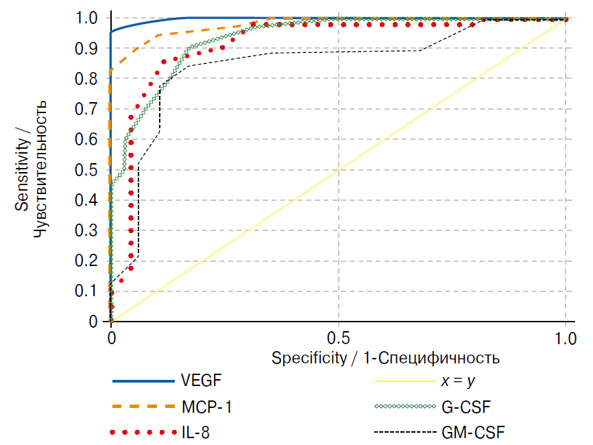 To assess the diagnostic utility for these markers, ROC analysis was performed (Fig. 1). The diagnostic utility was determined for VEGF (sensitivity – 95.2%, specificity – 95%), IL-8 (sensitivity – 83.9%, specificity – 85%), MCP-1 (sensitivity – 87.1%, specificity – 95%), GM–CSF (sensitivity – 87.1%, specificity – 85%), and G-CSF – 5.89 pg/ml (sensitivity – 77.3%, specificity – 90%).