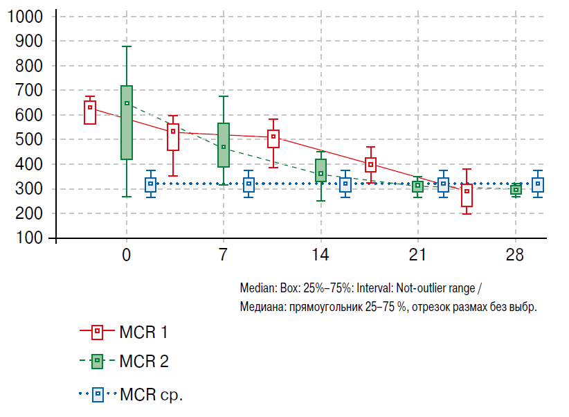 Resolving the obstruction caused a significant decrease in VEGF, MCP-1, IL-8, GM–CSF levels in the urine. Change of marker levels are shown in Figure 2–5 (X-axis – days, Y-axis – marker concentration, pg/ml; red curve – the group 1, green curve – the group 2, blue curve – the control group).