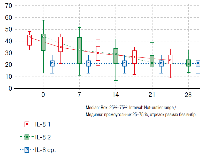 IL-8 | 20.6 (19–23.55) | 43.5 (38.2–45) | 43.7 (32.8–45.8) |