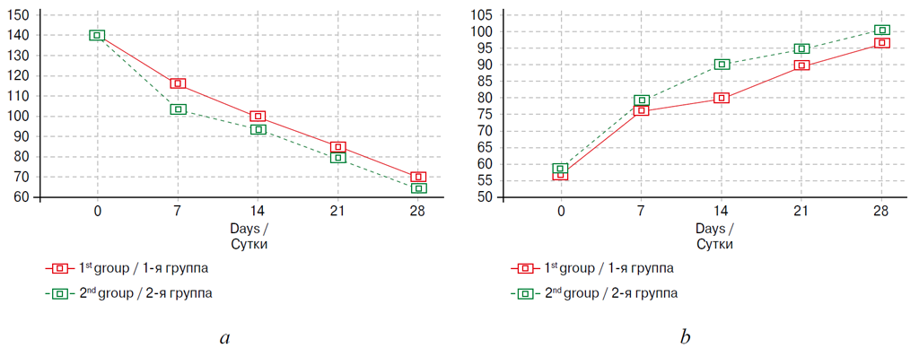 Assessment of renal function in both groups before nephrostomy showed an increase of serum creatinine up to 140±10.6 mcmol/l and a decrease in GFR up to 55±13.3 ml/min. After restoration of urine drainage from the kidney, the levels of these parameters became normalized, with a more rapid improvement in patients who received lercanidipine as nephroprotector (Fig. 6).
