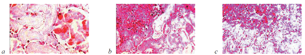 Fig. 1. Kidney parenchyma in the resection zone in rats in the control group on postoperative day 7. Hematoxylin and eosin stain, ×200. a: Necrosis of all tissue components of the kidney and hemorrhage in the glomerular capillary loops. b: Hemorrhagic infiltrate of external areas in the necrotic zone. с: Hemorrhagic infiltrate of external areas in the necrotic zone, with hemorrhages in the stroma of the destroyed renal parenchyma