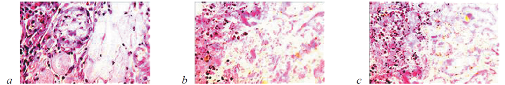 Fig. 6. Kidney parenchyma in the resection zone in rats in the control group on postoperative day 14. Hematoxylin and eosin stain. Morphonuclear leukocyte infiltration and young fibroblasts and fibrillar structures on the border between the necrotic and intact renal parenchyma. Magnification: а, b ×200; c ×400