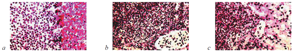 Рис. 3. Состояние ткани почки в зоне резекции у крыс контрольной группы на 7-е сутки после операции. Окраска гематоксилином и эозином. Ув. ×200: a — микроабсцесс в некротизированной области почки, ткань вокруг него пропитана кровью; b, c — микроабсцесс граничит с дистрофически измененной, но жизнеспособной тканью почки. Геморрагическая инфильтрация вокруг него отсутствует