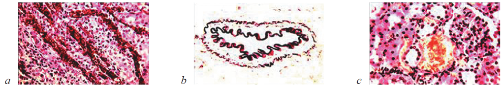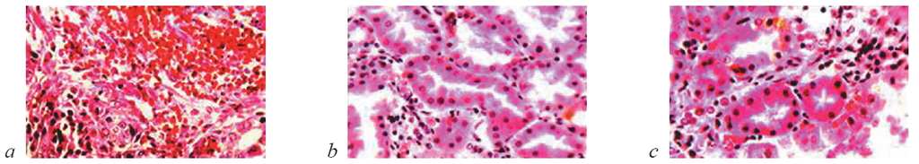 Рис. 4. Состояние ткани почки в зоне резекции у крыс контрольной группы на 7-е сутки после операции. Ув. ×200: a — резкое полнокровие и отек стромы мозгового слоя. Окраска гематоксилином и эозином; b — дистония артерии среднего калибра корковой зоны. Окраска по Харту; c — кровоизлияния в строму. Гидропическая дистрофия эпителия извитых канальцев. Окраска гематоксилином и эозином