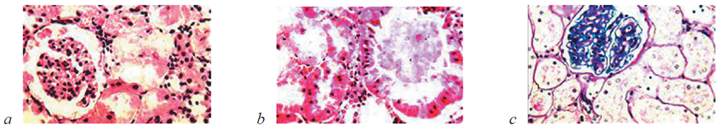 Рис. 5. Состояние ткани почки в зоне резекции у крыс контрольной группы на 7-е сутки после операции. Ув. ×200: а — гидропическая дистрофия и некроз эпителия извитых канальцев с наличием в их просвете зернистых цилиндров. Нейтрофилы в строме. Окраска гематоксилином и эозином; b — гидропическая дистрофия и некроз эпителия извитых канальцев и собирательной трубочки. Наличие в просвете тубулярных структур зернистых цилиндров. Лейкоцитарная инфильтрация стромы. Окраска гематоксилином и эозином; c — резкое снижение содержания гликогена в эпителии канальцев. ШИК-реакция