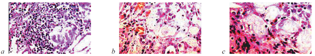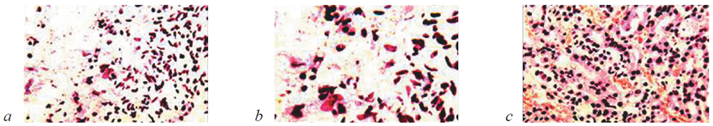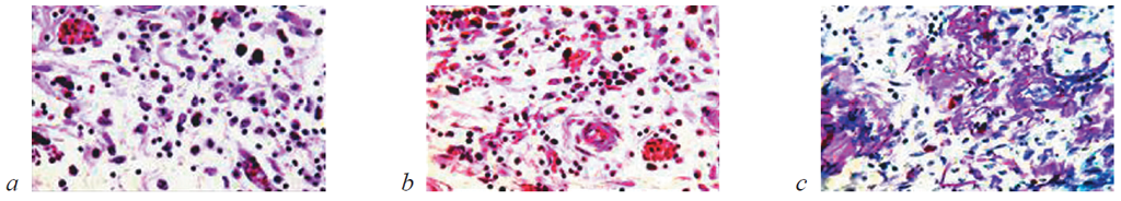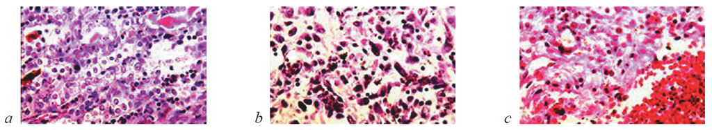 Рис. 6. Состояние ткани почки в зоне резекции у крыс контрольной группы на 14-е сутки после операции. Окраска гематоксилином и эозином. Наличие на границе между некротизированной и жизнеспособной тканью почки полиморфноклеточного воспалительного инфильтрата, молодых фибробластов и фибриллярных структур. Увеличение: a, b — ×200; c — ×400