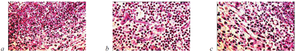 Рис. 7. Состояние ткани почки в зоне резекции у крыс контрольной группы на 14-е сутки после операции. Окраска гематоксилином и эозином. Наличие вокруг микроабсцесса формирующейся капсулы с фибробластами, волокнистыми структурами и капиллярами. Увеличение: a — ×200; b, c — ×400
