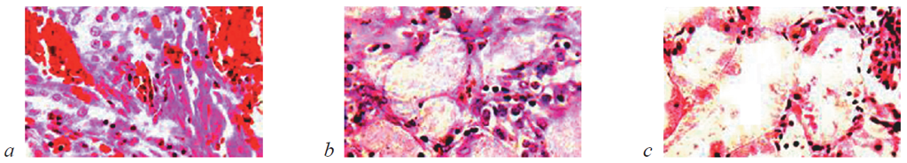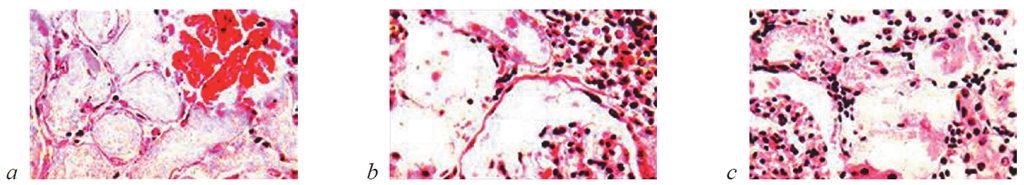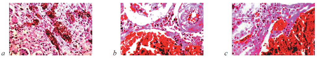 Рис. 8. Состояние ткани почки в зоне резекции у крыс контрольной группы на 14-е сутки после операции. Окраска гематоксилином и эозином. Ув. ×200: a — резкое полнокровие и отек стромы; b, c — кровоизлияния в ткань коркового слоя. Наличие вокруг кровоизлияний и среди скоплений крови глыбок гемосидерина