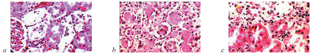 Рис. 9. Состояние ткани почки в зоне резекции у крыс контрольной группы на 14-е сутки после операции. Окраска гематоксилином и эозином: a — зернистая и гидропическая дистрофия эпителия извитых канальцев. Наличие в строме отдельных глыбок гемосидерина. Ув. ×200; b — гидропическая дистрофия и некроз отдельных клеток извитых канальцев. Наличие в просвете их зернистых цилиндров. Ув. ×200; c — зернистая и гидропическая дистрофия канальцевого эпителия. Гемосидероз стромы. Ув. ×400