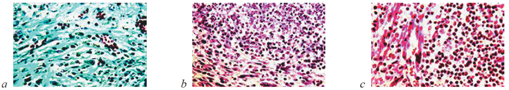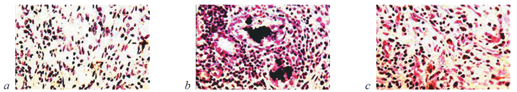 Рис. 11. Состояние ткани почки в зоне резекции у крыс контрольной группы на 28-е сутки после операции: a, b — замещение зоны некроза рыхлой оте чной грануляционной тканью, богатой сосудами и тонкими фибриллами. Наличие среди грануляций скоплений гемосидерина. Окраска гематоксилином и эозином; c — переплетающиеся ретикулиновые волокна в области разрастающихся грануляций. ШИК-реакция. Увеличение: a — ×400; b, c — ×200