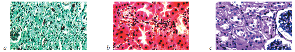 Рис. 18. Состояние ткани почки в зоне (a) и выше зоны (b, c) резекции у крыс основной группы, которым вводили α-токоферола ацетат, на 28-е сутки после операции: a — коллагеновый каркас новообразованной соединительной ткани. Окраска по Массону. Ув. ×200; b — эпителиальная выстилка канальцев представлена крупными клетками с эозинофильной цитоплазмой. Окраска гематоксилином и эозином. Ув. ×400; c — повышение содержания гликогена в эпителии извитых канальцев. ШИК-реакция. Ув. ×200