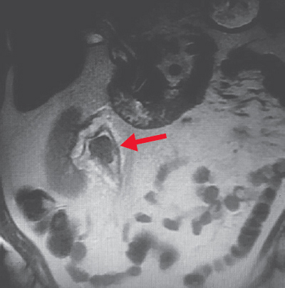 Рис. 1. Магнитно-резонансная томография. Опухоль лоханки правой почки (указана стрелкой)