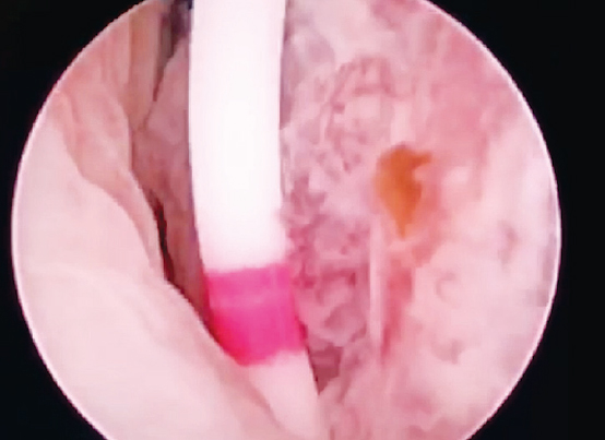 Fig. 2. Endoscopic picture of a tumor on the renal pelvis. Ureteral catheter in the cavitary system of the right kidney