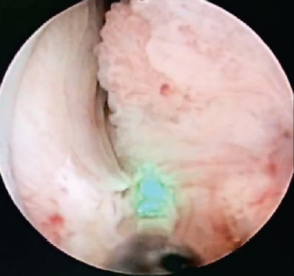 Рис. 3. Этап резекции стенки лоханки с опухолью с помощью тулиевого лазера единым блоком