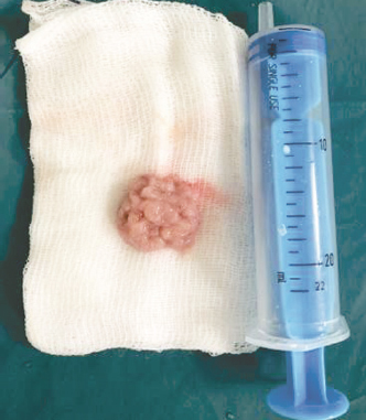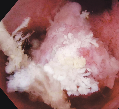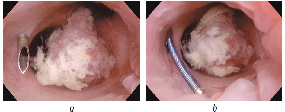 Используемые параметры лазера для резекции: мощность 1,0 Дж, частота 10 Гц. После en-block-резекции удаленная опухоль извлечена наружу при помощи эндоскопических щипцов (рис. 4).
