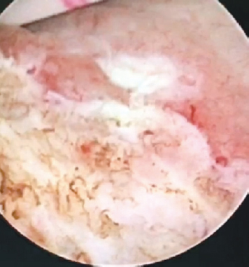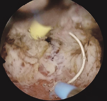 Под эндотрахеальным наркозом после катетеризации ипсилатерального мочеточника в положении пациента на животе под ультразвуковым и рентгенологическим контролем произведена пункция полостной системы правой почки через среднюю группу чашек. Пункционный ход бужирован по гидрофильной струне до 28 Ch и установлен кожух Амплатц. С помощью резектоскопа выполнена ревизия полостной системы правой почки, выявлена мелковорсинчатая опухоль лоханки на ножке (рис. 2). Произведена en-block-резекция стенки лоханки с опухолью при помощи тулиевого волоконного лазера FiberLase U2 (рис. 3).