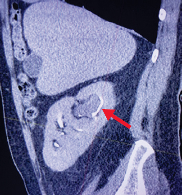 Оперативное лечение завершено установкой нефростомического дренажа, который был удален на 4-е сутки. Послеоперационный период протекал гладко, пациент был выписан на амбулаторный этап лечения.