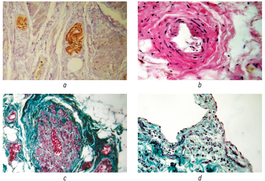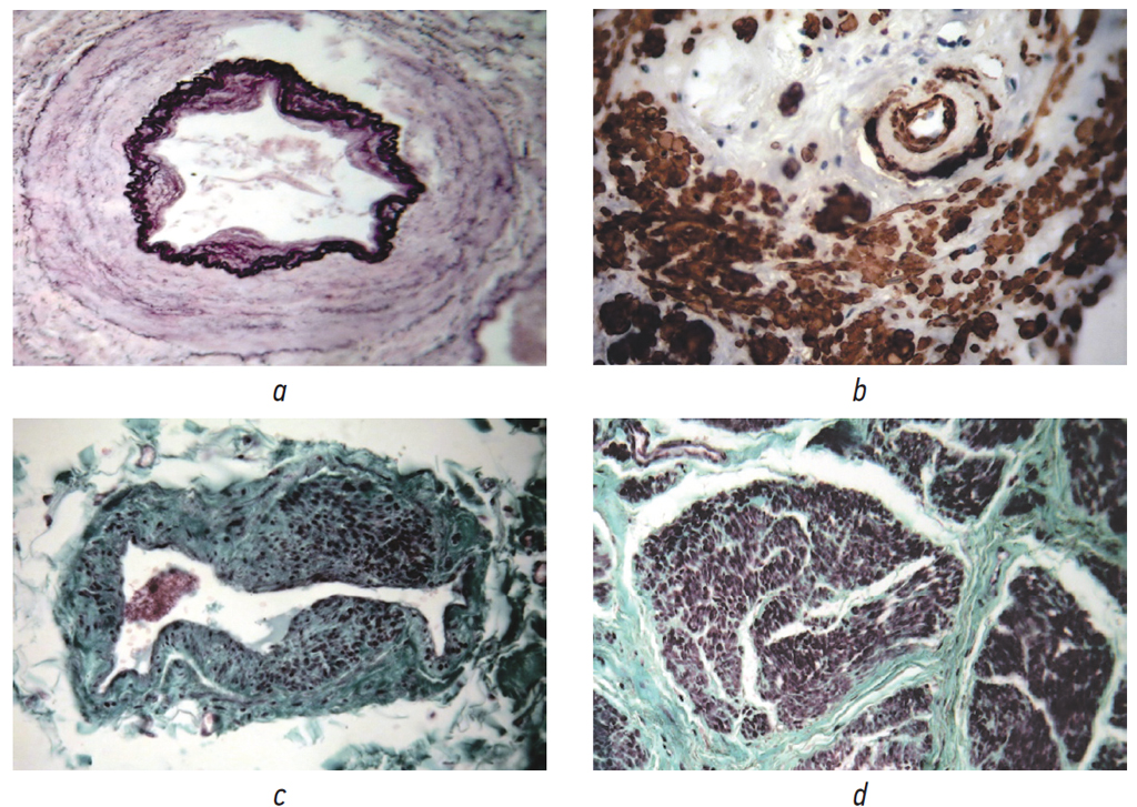 Рис. 1. Структурные изменения стенки мочевого пузыря у мужчин пожилого и старческого возраста при гиперплазии предстательной железы: а — окраска фукселином по Харту (увел. ×200); b — непрямой иммунопероксидазный метод с антителами к α-SMA (увел. ×200); c, d — окраска по Массону с использованием бриллиантового зеленого (увел. ×200 — c, увел. ×160 — d)