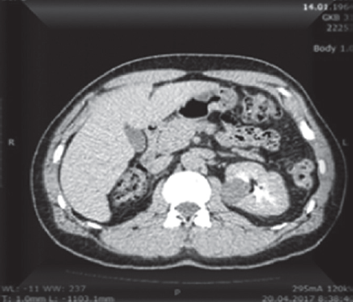 В данном сообщении описано клиническое наблюдение больного М., 53 года, оперированного по поводу опухоли единственной левой почки. Правая почка была удалена вследствие гидронефротической трансформации 32 года назад. В дальнейшем пациент находился под наблюдением амбулаторных уролога и нефролога, признаков снижения суммарной почечной функции не отмечалось. В апреле 2017 г. при плановом УЗИ выявлено образование верхней трети единственной левой почки. С целью уточнения диагноза была выполнена МСКТ, при которой было подтверждено наличие внутриорганного образования верхней трети левой почки размером 3,0 × 2,9 × 2,3 см, прилежащего к чашечно-лоханочной системе (рис. 1). По данным МСКТ и остеосцинтиграфии поражение регионарных лимфатических узлов и отдаленные метастазы отсутствовали.