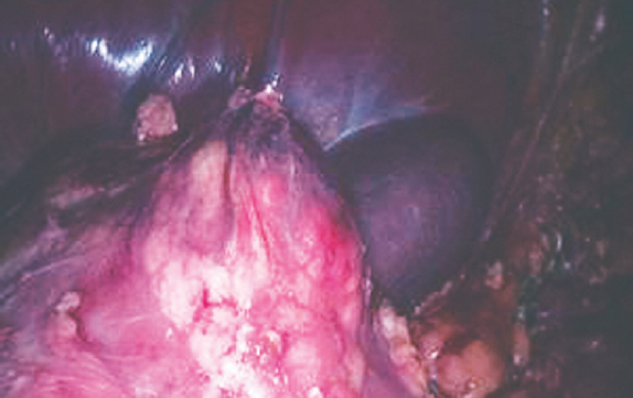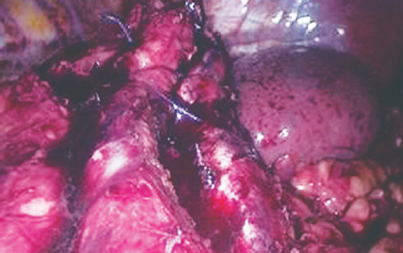 В мае 2017 г. больной был госпитализирован в ФГБУ «РНЦРХТ им. акад. А.М. Гранова» с диагнозом: «Опухоль единственной левой почки, сT1N0M0». Проведено обследование. Поясничная область не изменена, безболезненна при поколачивании, почки не пальпируются. В правой поясничной области определяется послеоперационный рубец линейной формы длиной 10 см после нефрэктомии. Патологических изменений в лабораторных анализах крови и мочи не выявлено. 24.05.2017 выполнена лапароскопическая резекция единственной левой почки. Во время операции поддерживался пневмоперитонеум 12 мм рт. ст. Первым этапом была вскрыта брюшина по линии Тольда слева. Почка мобилизована по передней, задней и латеральной поверхностям. В верхней трети левой почки визуализировано образование размером 3,1 × 3 × 2,5 см. Далее была мобилизована почечная ножка. Учитывая наличие единственной почки, было принято решение о выполнении операции без выключения кровотока и тепловой ишемии. Паранефральная клетчатка отсепарована по дистальному краю опухоли, после чего с использованием ультразвукового скальпеля выполнена резекция опухоли (рис. 2, 3). При пересечении артерии, питающей опухоль, отмечено интенсивное кровотечение, вследствие чего культя сосуда была прошита нитями пролен 3.0. Во время резекции была вскрыта верхняя группа чашечек, дефект чашечно-лоханочной системы ушит нитями викрил 2.0. С целью минимизации ишемии и некроза паренхимы почки от наложения гемостатических швов было решено отказаться. Окончательный гемостаз был достигнут с помощью гемостатической губки «Тахокомб». Операция завершена дренированием зоны операции. Гистологическое описание удаленного образования левой почки: «папиллярный рак почки 1-го типа, Grade 1, хирургический край отрицательный».