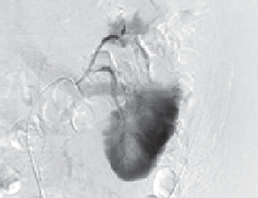 Рис. 5. Контрольная ангиография после суперселективной эмболизации верхней сегментарной артерии. Экстравазации контрастного вещества нет
