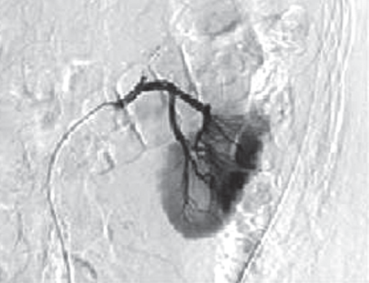 Рис. 4. Ангиография левой почечной артерии. Экстравазация контрастного вещества через культю верхней сегментарной артерии